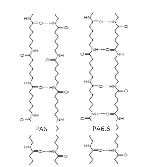 PA6由己內酰胺開環(huán)再聚合,PA66由己二胺和己二酸聚合而成。二者分子鏈中都含有如下的酰胺基團結構:
