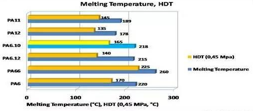 由圖可以看出:PA66的熔融溫度和熱變形溫度最高,PA6、PA610、PA612次之,PA11、 PA12耐熱性最差。